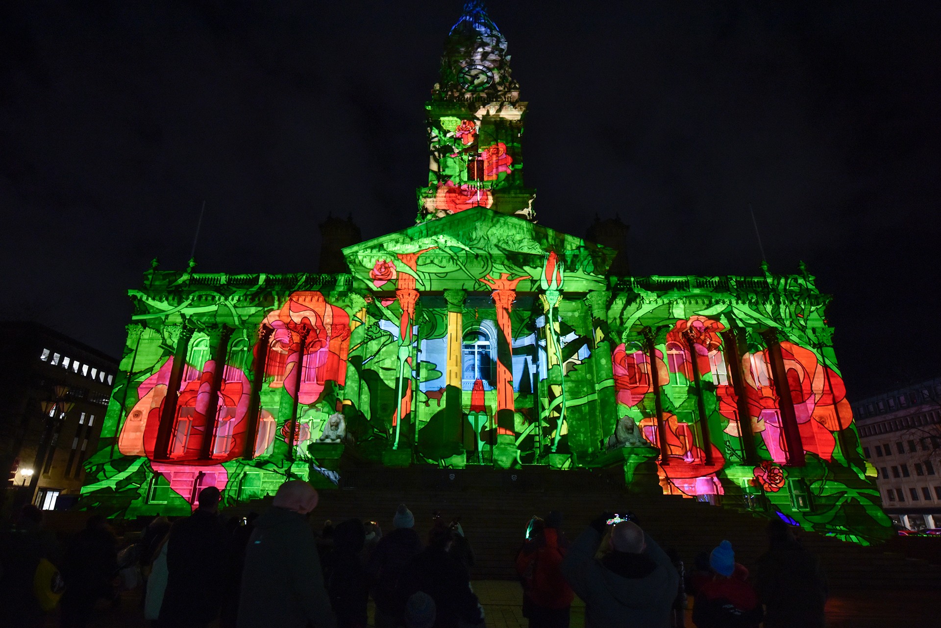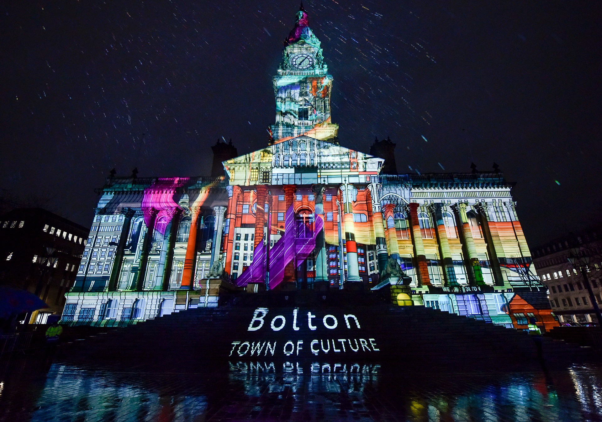 YARN is a stunning large-scale projection on Bolton’s iconic Town Hall, created by NOVAK featuring music by Ed Carter. This installation transforms the building into a series of captivating scenes filled with vibrant colour, dynamic motion, and immersive sound. The artwork honours Bolton’s rich history, tracing its journey from a small rural market town to a powerhouse of the Industrial Revolution, transforming working practices across the globe. It highlights the vibrant production of the town’s mills and the work of its renowned designers, while also showcasing some of Bolton’s most cherished landmarks and its current role as Greater Manchester’s Town of Culture.